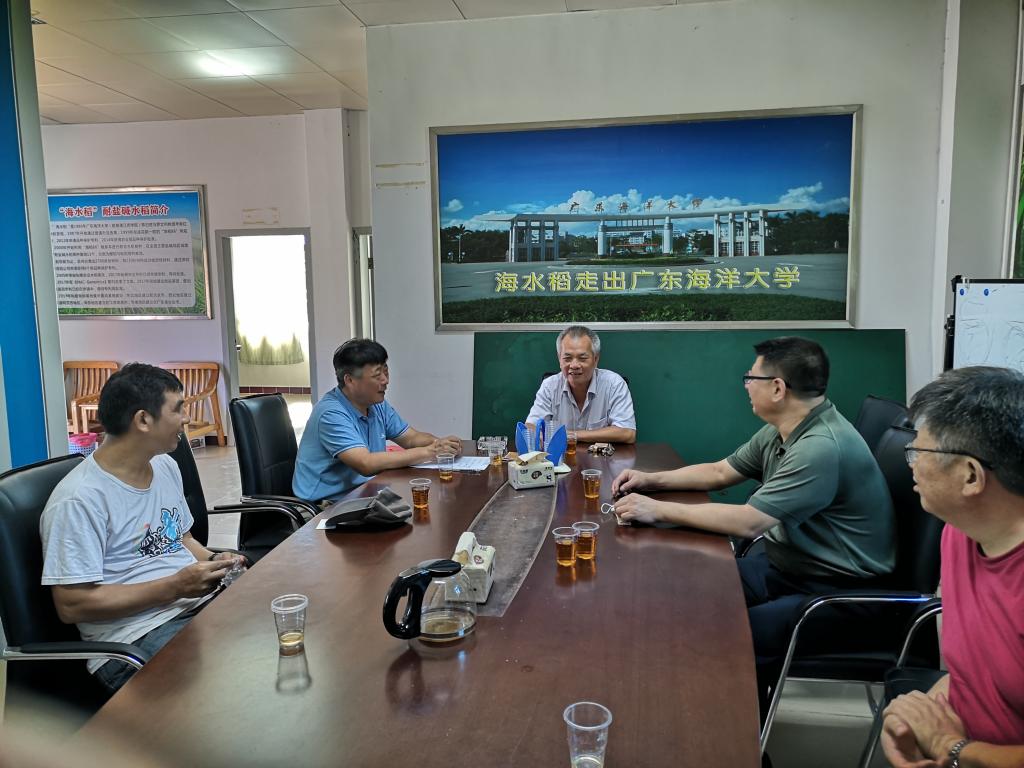 在随后开展的座谈会上,陈日胜就海水稻的育种与应用推广情况进行了简要汇报,并阐述了将海宴镇华侨农场这块大面积盐渍地打造成海水稻渔稻共作生态农业产业园,从农业生产到加农产品加工,开发市场营销,直接带动农民增收,实现乡村振兴的必要性和可行性。谭北平讲话指出,陈日胜负责的我校台山海水稻种养基地受到省委和相关厅领导的重视,受到湛江市和江门市的重视,这对于建设海水稻种养结合产业园作为我省振兴乡村和脱贫攻坚亮点工程具有重要价值。我校十分重视海水稻研发工作,支持陈日胜和老师们共同开展海水稻育种与推广应用,通过获得政府支持建设海水稻种养结合、双水双绿现代农业产业园,实现一二三产融合发展,同时作为我校在江门的海水稻渔稻共作研发基地,将有力促进我校负责的国家耐盐碱水稻技术创新中心华南中心的建设与发展。与会领导和专家积极发言,就海水稻的研发过程和海水稻品种品系材料与盐碱地生态环境以及渔稻共作等方面进行了探讨,对建设台山海水稻种养结合现代农业产业园和海水稻基地,支撑国家耐盐碱水稻技术创新中心华南中心的建设与发展,明确表明了支持的态度。