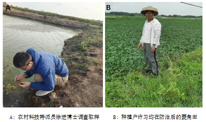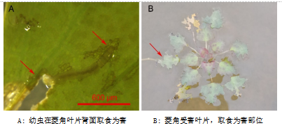 郑殿峰院长第一时间安排科技服务团队下乡助农,农村科技特派员徐进博士、师沛琼博士等人实地察看菱角害虫危害情况,通过野外调查、室内饲养,记录了其为害特点、形态特征,并进行了分子鉴定。经鉴定该害虫为林间环足摇蚊,在国内尚无为害菱角记录,其幼虫啃食叶片,严重爆发可造成菱角绝产。学院科技服务团队迅速制定防治方案,采用调控水肥,物理防治加化学防治相结合的方法,解决了水面施药效果差的难题,为种植户挽回了经济损失。