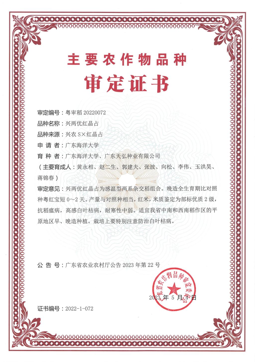 近日,从广东省农业农村厅的《关于广东省2022年度农作物品种审定通过品种的公告》获悉,我校郭建夫研究员、黄永相副教授课题组育成的特种稻新品种“兴两优红晶占”通过了我省农作物品种审定(审定编号:粤审稻20220072)。“兴两优红晶占”糙米棕红色,米质达部颁二等优质食用稻品种品质标准,稻米香气物质2-乙酷-1-呲咯啉(2-AP)含量达146.85μg/kg,属于红香型优质杂交籼稻新品种。