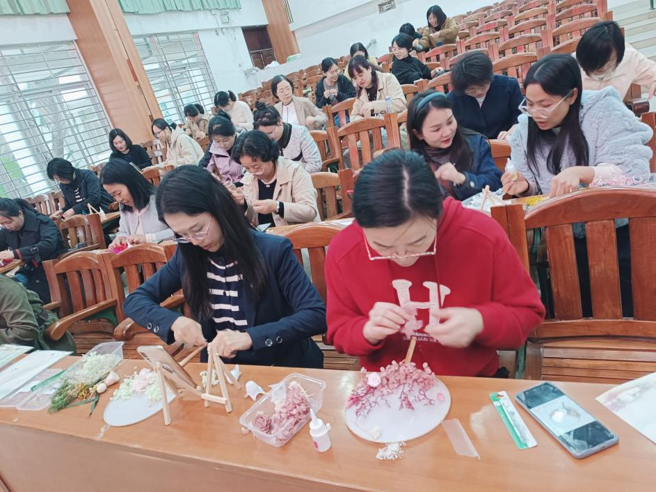 活动开始前,插花老师甄珍为大家讲解团扇文化、干花制作技巧、配色技巧等基本技能,带领大家学习团扇制作技能。女教工们认真听取讲解后,便投入到干花团扇的制作当中,气氛活跃愉快。在甄老师的指导下,大家通过构图、修剪、粘贴等步骤,一个个素面团扇被优美雅致的干花素材填满,变成了一幅幅色彩斑斓的“艺术品”。