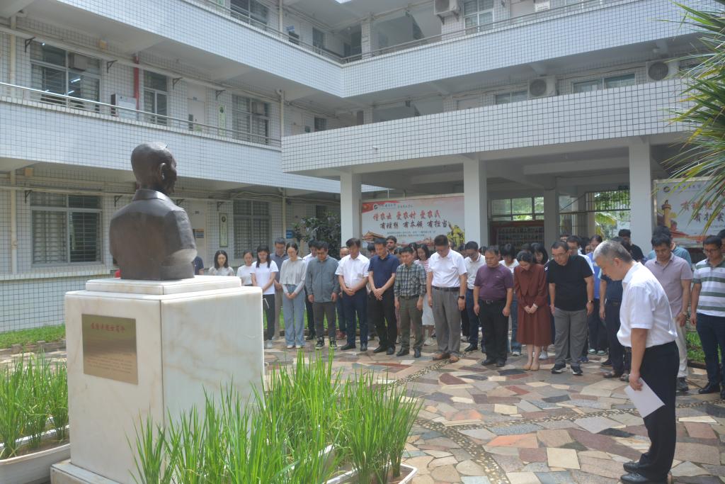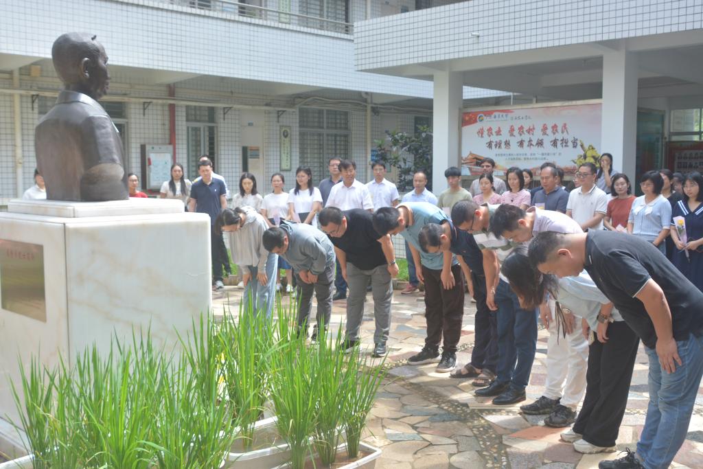 禾下乘凉梦,一梦逐一生。在袁隆平院士逝世三周年之际,为学习和弘扬袁隆平院士科学家精神,激励广大师生学农、爱农、兴农、强农,不忘初心,勇攀科研高峰,为乡村振兴、国家粮食安全做出更大贡献。2024年5月22日上午,学院在兴农楼我校特聘院士袁隆平铜像前举行“致敬稻田追梦人,弘扬科学家精神”追思活动。学院领导和师生代表90余人参加,学院党委副书记王继全主持。