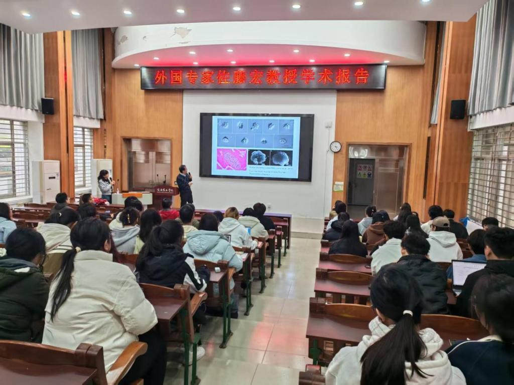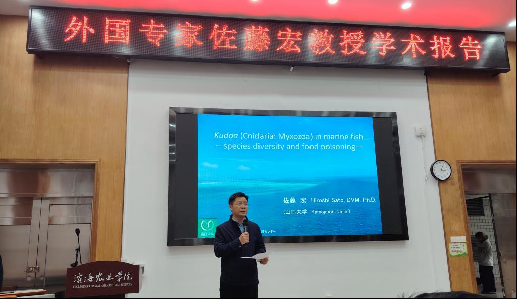 邀请,日本山口大学佐藤宏教授在湖光校区兴农楼109报告室为我校师生作了题为《Kudoa (Cnidaria: Myxozoa) in marine fish species diversity and food poisoning》的学术报告。报告会由院长马驿教授主持,动物医学系师生代表及水产学院水医系教师代表80余人参会。