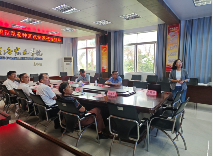 会上,刘文超副院长致欢迎词并简要介绍了学院基本情况。项目负责人卢艳丽博士专题汇报了湛江站自设立以来的建设进展及任务完成情况。站点创建人刘艳芬教授进行了补充说明。在查阅资料,听取汇报后,对照国家草品种区域试验站建设标准,专家组对湛江站的基础设施、基本条件、区试队伍和任务完成情况给予了充分肯定。建议要加强乡土草种的选育,特别是耐盐碱牧草种质创新,促进科技成果转化,推动草-畜一体化进程;加强与属地政府主管部门联系,通过学校积极向全国畜牧总站和国家牧草产业体系建言献策。