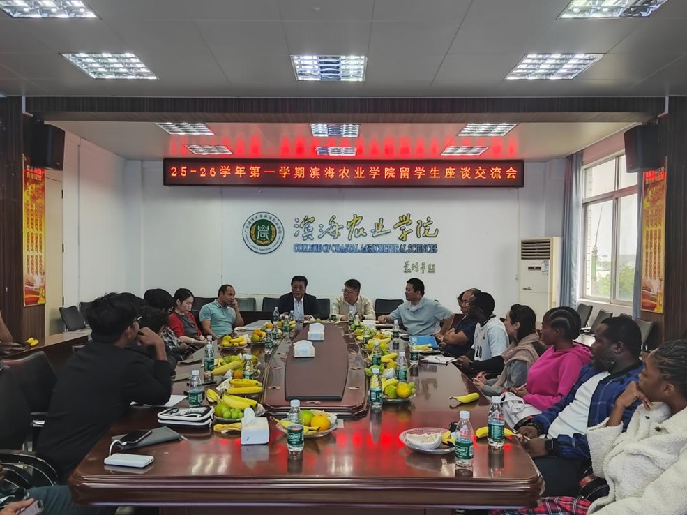 在兴农楼419召开国际留学生座谈交流会。国际交流合作部部长陈进军教授、学院党委书记郑殿峰教授,冯乃杰、凌宇、朱宏波三位教授,谢青博士及辅导员肖为老师、教务员钟子媚老师出席,与14名国际留学生面对面答疑解惑、指引方向。