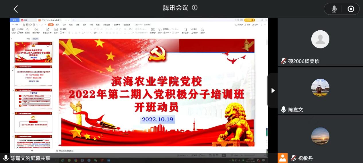 分党校2022年第二期入党积极分子培训班开班动员会以腾讯会议形式举行。学院党委副书记陈嘉文作动员并讲授第一专题,各学生党支部入党积极分子共373人参加了会议。会议由组织员祝敏丹主持。