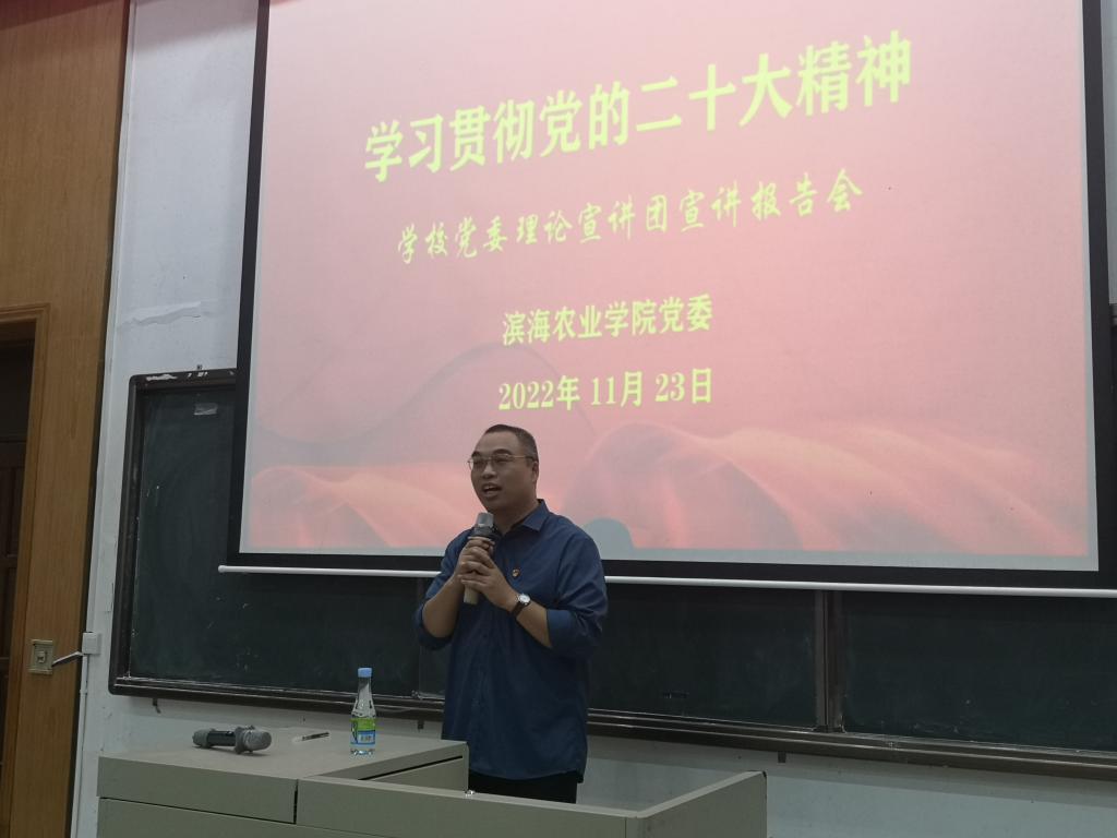 在湖光校区兴农楼109室召开学习贯彻党的二十大精神宣讲报告会,由学校党委理论宣讲团成员李林杰博士主讲,学院党委副书记、院长(主持党委工作)郑殿峰主持会议,全院教职工、学生代表等115人参加。