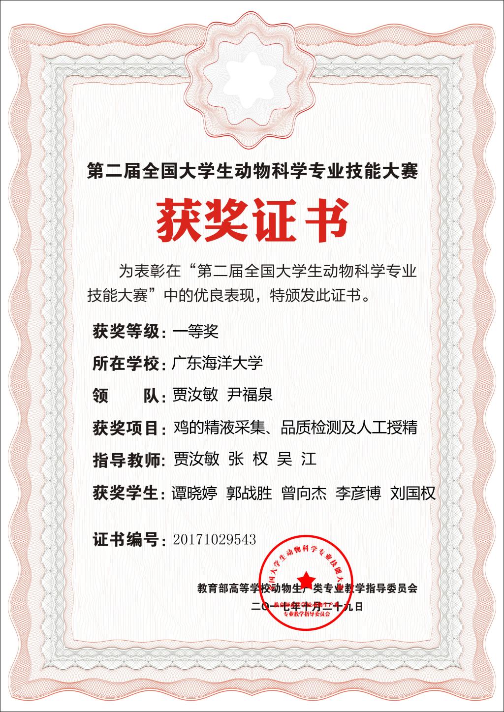 第二届全国大学生动物科学专业技能大赛一等奖证书和集体特等奖证书